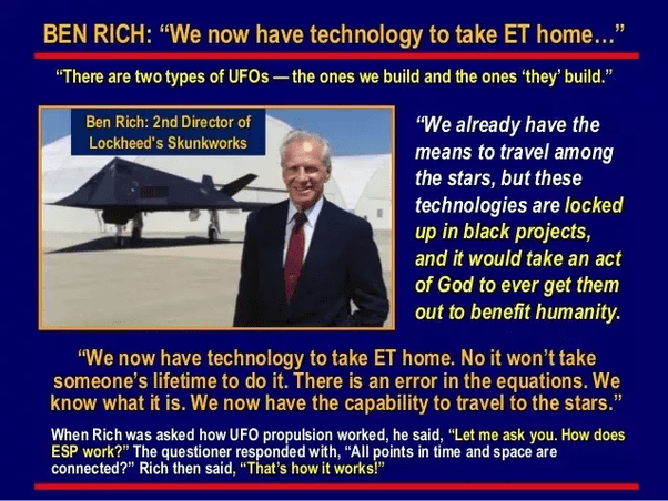 THE TECHNOLOGY THAT IS SEQUESTERED INSIDE DEEP BLACK PROJECTS WOULD CHANGE THE COURSE OF HUMANITIES FUTURE AND END HUMAN POVERTY OVERNIGHT!! BUT AS BEN RICH OF LOCKHEED SKUNKWORKS STATED, “IT WOULD TAKE AN ACT OF THE CREATOR TO EVER GET THEM OUT TO BENEFIT HUMANITY.” OR PERHAPS A VISITING BENEVOLENT ET GALACTIC COUNCIL WOULD ASSIST?