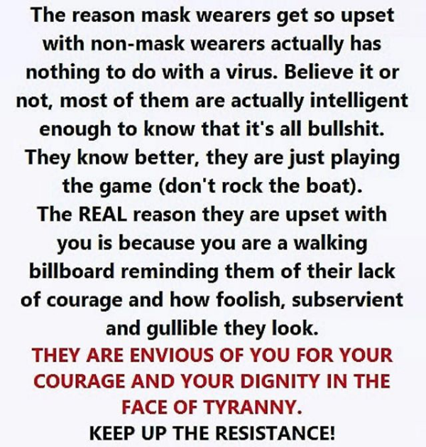 The Wearing Of A Mask Is To Literally Make You A faceless Entity, To Deprive Your Brain Of the Oxygen It Needs. The Whole Covid Hoax Gives You Insane Directives Such As Social distancing, Which Has No Basis In Science, Short Distances Have No Effect On The Movement Of Anything Through The Air. (Ie) In Restaurants You Can Remove Your Mask, When You Stand Up You Must Wear It?????? These Directives Are Designed To Destroy Your Self Respect By Giving Clearly Ridiculous Rules To Obey. Once Your Self Respect Is Gone Only Submission Is left!