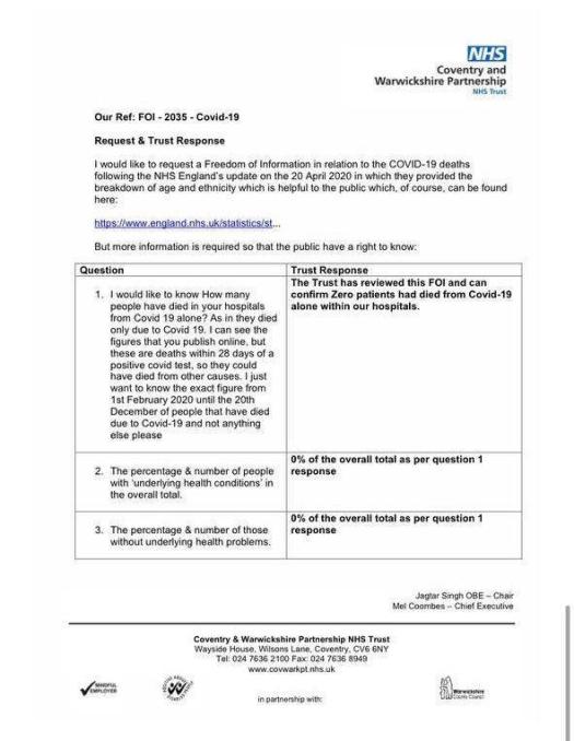 Yesterday’s post that exposed the fact that no one had died from the Hoax Covid pandemic that was outlined in a correspondence from the NHS National Health Service document that was sent by, I am assuming, an NHS employee who wasn’t aware of the cover up or that he or she wasn’t supposed to release those details. See the form below……..